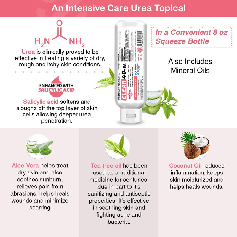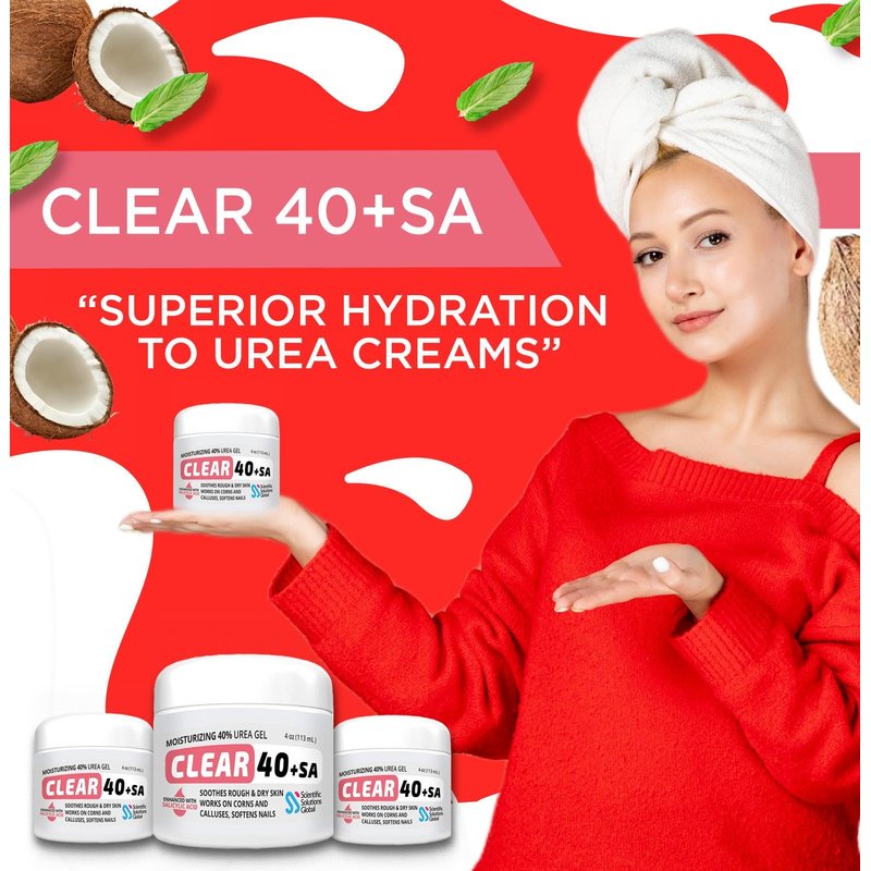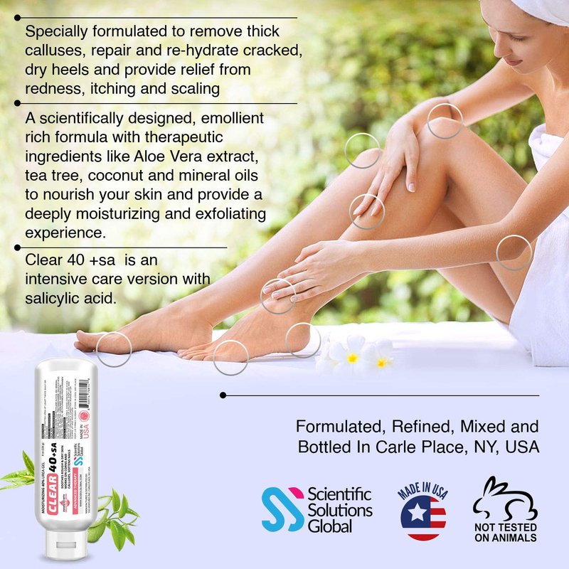 - 𝐄𝐗𝐅𝐎𝐋𝐈𝐀𝐓𝐈𝐎𝐍 𝐀𝐍𝐃 𝐇𝐘𝐃𝐑𝐀𝐓𝐈𝐎𝐍 𝐖𝐈𝐓𝐇 𝐒𝐀𝐋𝐈𝐂𝐘𝐋𝐈𝐂 𝐀𝐂𝐈𝐃 - CLEAR 40 +SA Urea Cream combines 40% Urea with 2% Salicylic Acid to intensely hydrate and exfoliate your skin, removing dead skin cells and allowing deeper moisture penetration. Foot cream with urea and salicylic acid perfect for treating stubborn calluses, cracked heels, and dry skin on hands, feet, and elbows