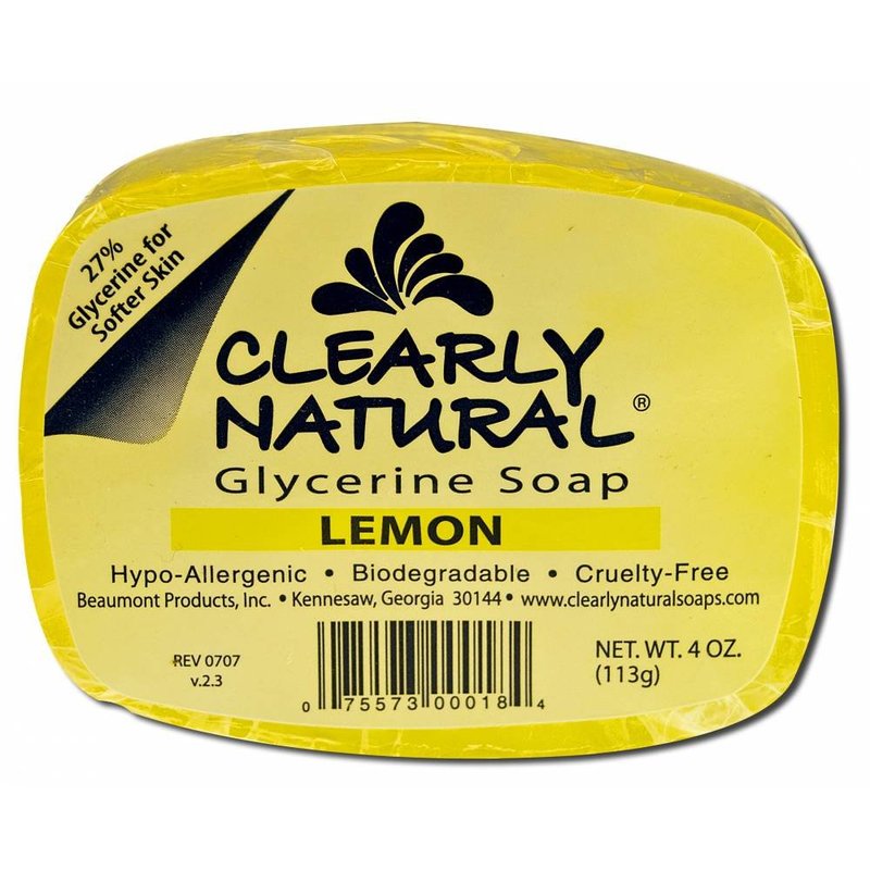 Clearly Natural Lemon Glycerin Bar Soap is a transparent bar that provides gentle all-over cleansing for face, hands and body. Clearly Natural Lemon Glycerin Bar Soap mild, all-vegetable formula is ideal for all skin types. Clearly Natural Lemon Glycerin Bar Soap has a high glycerin content of 27%. Clearly Natural Lemon Glycerin Bar Soap is non drying and will not leave skin dry or itchy. Clearly Natural Lemon Glycerin Bar Soap rinses off easily and leaves no sticky film on your skin or your tub. Clearly Natural Lemon Glycerin Bar Soap is an all-vegetable formula with no pore-clogging animal ingredients. Clearly Natural Lemon Glycerin Bar Soap is hypo-allergenic and dermatologist recommended. Clearly Natural Lemon Glycerin Bar Soap is biodegradable from making it to using it, Clearly Natural Lemon Glycerin Bar Soap doesn't harm the environment. Clearly Natural Lemon Glycerin Bar Soap comes in an attractive, transparent style. Clearly Natural Lemon Glycerin Bar Soap is hypo-allergenic and cruelty free. You'll Feel The DifferenceEnriched with natural vegetable glycerine, Clearly Natural Soap leaves your skin clean, refreshed, and naturally moisturized. Clearly Natural uses a natural base of vegetable derived cleansers, vegetable glycerin, saponified vegetable oils, and natural essential oils and fragrances. Vegetable glycerin is a natural humectant that draws moisture to the skin, keeping it fresh, soft and moist, even in the driest climates "Saponified" is the traditional way of making soap from vegetable oil.Clearly Natural strives to provide honest, pure and natural products to their customers and will label any newly formulated products as NEW, so you will know when they have made a change. Youll also feel good knowing that most Clearly Natural products are 100% natural, and that all Clearly Natural products are cruelty free. Clearly Natural never tests their products (or their ingredients) on animals.