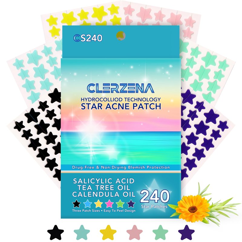Clerzena star pimple patches for face black yellow, pink, blue, green and purple offer pimple spot treatment for face. The blemish patches for face are pimple patches star with Salicylic Acid, Tea Tree Oil and Calendula Oil acne stars. They can be used as star patches for pimples overnight and daytime spot patches for pimples that blend well with all skin types and color. The 240 pack pimple patches for face star offer three sizes of acne patches salicylic acid protection on easy to peel sheets, eliminating any wasted acne sticker like other brands pore strips when applying. With six different colors, black star pimple patches, pink star pimple patches, blue star pimple patches, yellow star pimple patches, green star pimple patches, purple star pimple patches, Clerzena star shaped pimple patches for face is a perfect star pimple patches gift set. The star zit patches for face are easy to apply and easy to wear night acne patch star and daytime pimple patch star. parches para acne parches de acne estrella