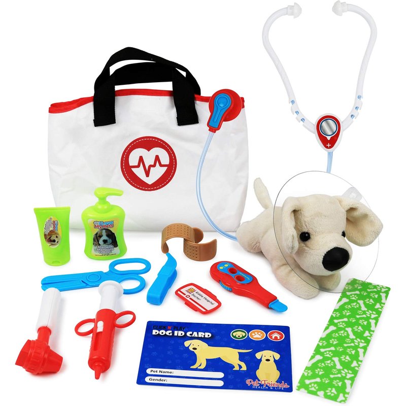 - πͺ BUILT TO LAST - Crafted to withstand active play, this vet set is made from high-quality materials, ensuring hours of engaging and lasting fun for your child. Includes a Plush Puppy, Dog Bag, Stethoscope and other high quality pretend vet doctor tools.