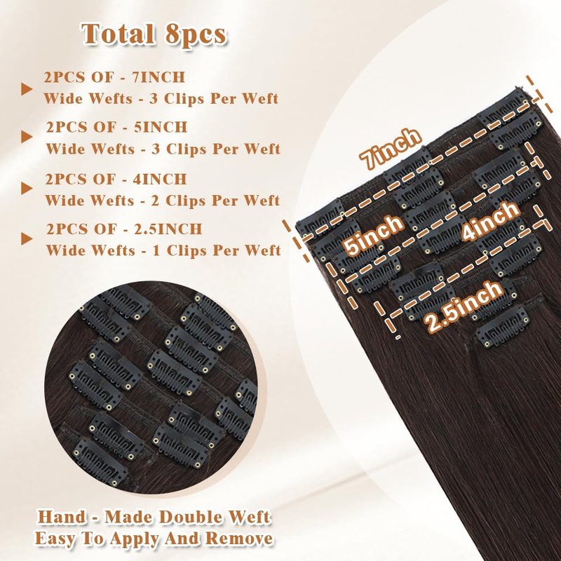 - ★Clip in Hair Extensions Material: Our straight human hair clip in hair extensions are made of 100% unprocessed virgin hair,high quality,no shedding & no tangle,healthy, natural,no chemistry,soft and blends well with many hair textures.