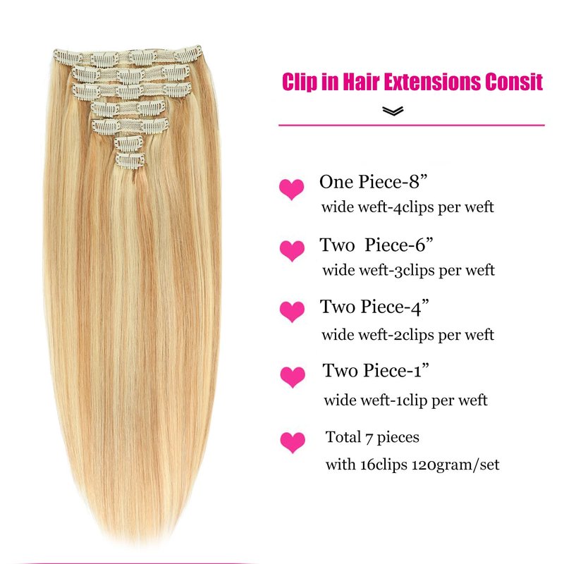 - 7pcs, 120g (with clip). 1sets hair extensions for thick hair, 2 sets for thin hair. The stainless steel clip is never rusty and easy to clean. The hair clip is covered with a layer of soft rubber, which can protect the scalp from damage. The clip uses the color closest to the hair color. No one can find your secret!