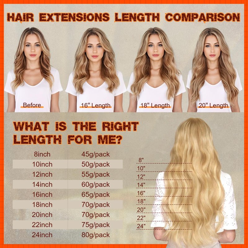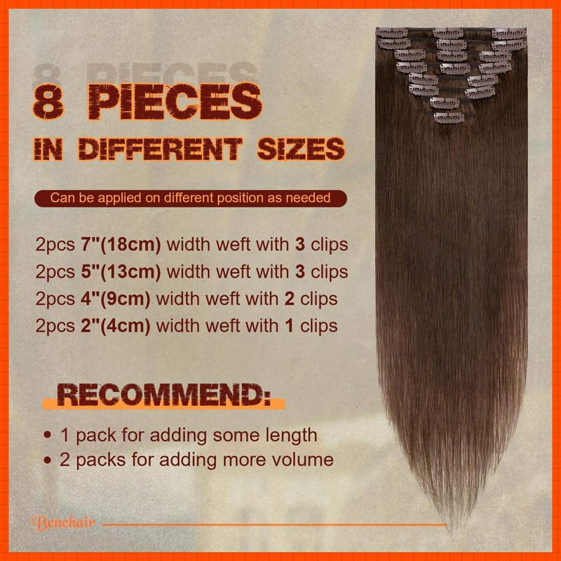 - Specifications: 8pcs design for freedom to style,45-80g for beauty, and 18 clips for stable attachment. Choose from 9 sizes and 22 colors to create your perfect look—add volume with the same color or highlights with a different shade. For longer hair, consider multiple packs for full coverage