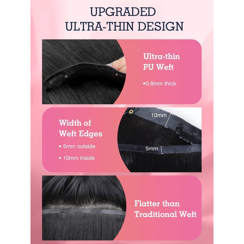 - 0.5-0.8mm Ultra-thin PU Weft: Flooyeer seamless clip in human hair extensions are made with ultra-thin 0.8mm PU weft for a seamless and breathable fit, featuring a 0.5cm wide adhesive for secure attachment and a natural blend with your hair. They are gentle on the scalp and your hair.