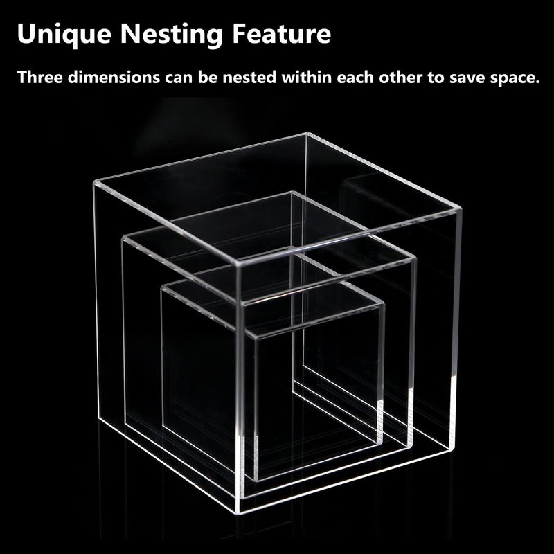 - 【Acrylic Box without Lid】 The lidless design gives these boxes a unique nesting and stackable feature. A 3-inch cube fits into a 4-inch cube and a 4-inch cube fits into a 5-inch cube.When not using these boxes, the nesting feature will greatly help you save space.