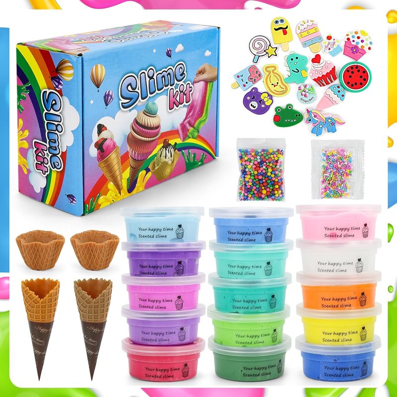 - 💕【15 PCS Butter Slime Toy Kit for Kids】This slime consists of 15 PCS 60 ml butter slime, 15 cute decorative gadgets in different shapes, 1 bag of foam balls, 1 bag of sugar granules and 2 ice cream molds, 2 cake molds. The contents are rich and lovely, can fully meet the DIY needs of kid.