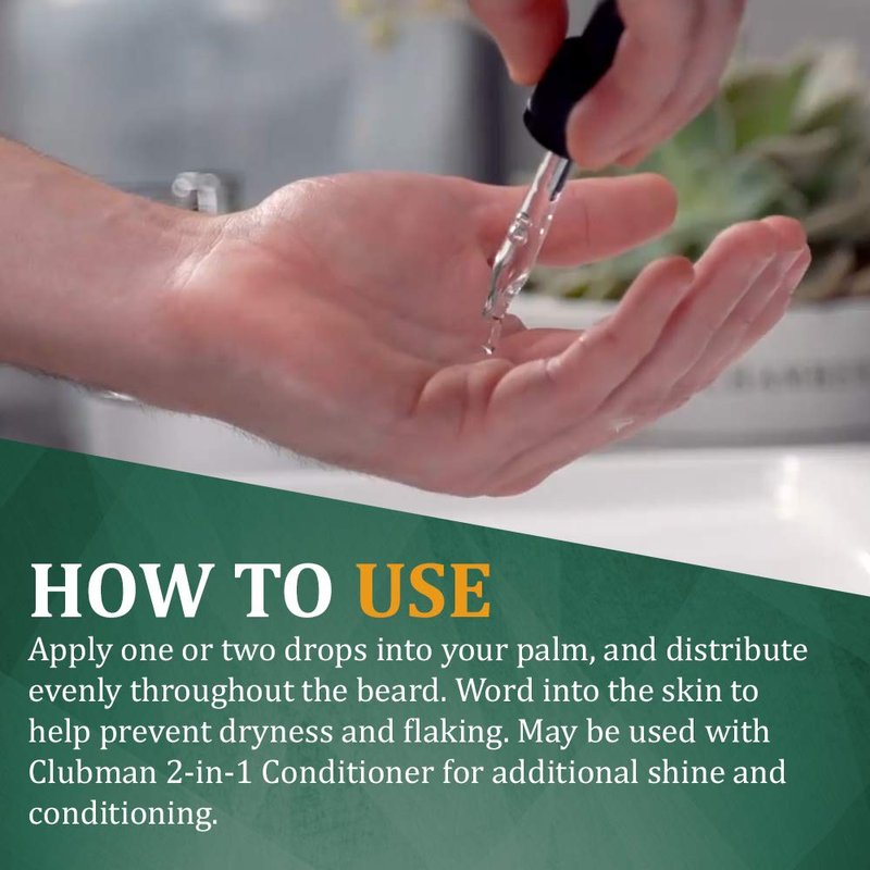 - PERFECT MOISTURE BALANCE FOR FACE AND BEARD: Clubman Pinaud Beard oil contains the perfect balanced moisture needed to promote healthy facial hair and skin! It absorbs quickly, and thanks to its powerhouse of nourishing essential oils, it leaves a lustrous glow to each strand while moisturizing and soothing the skin underneath. Noncomedogenic and suitable for all skin types, this versatile oil helps tame facial hair into a well-groomed mane and keeps your beard well-moisturized and nourished.
