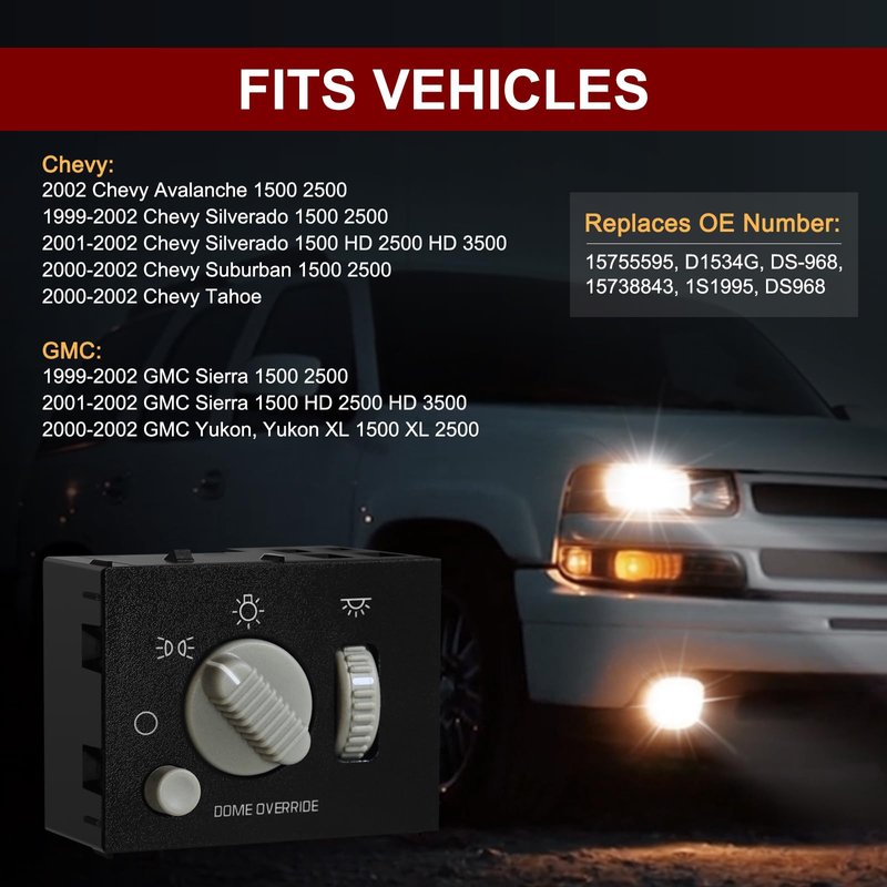 CMRDQD 15755595 Headlight Switch Headlamp Dimmer Switch for 1999-2002 Chevy Avalanche Silverado Suburban Tahoe GMC Sierra Yukon 1500 2500 3500 Instrument Panel Dimmer Switch