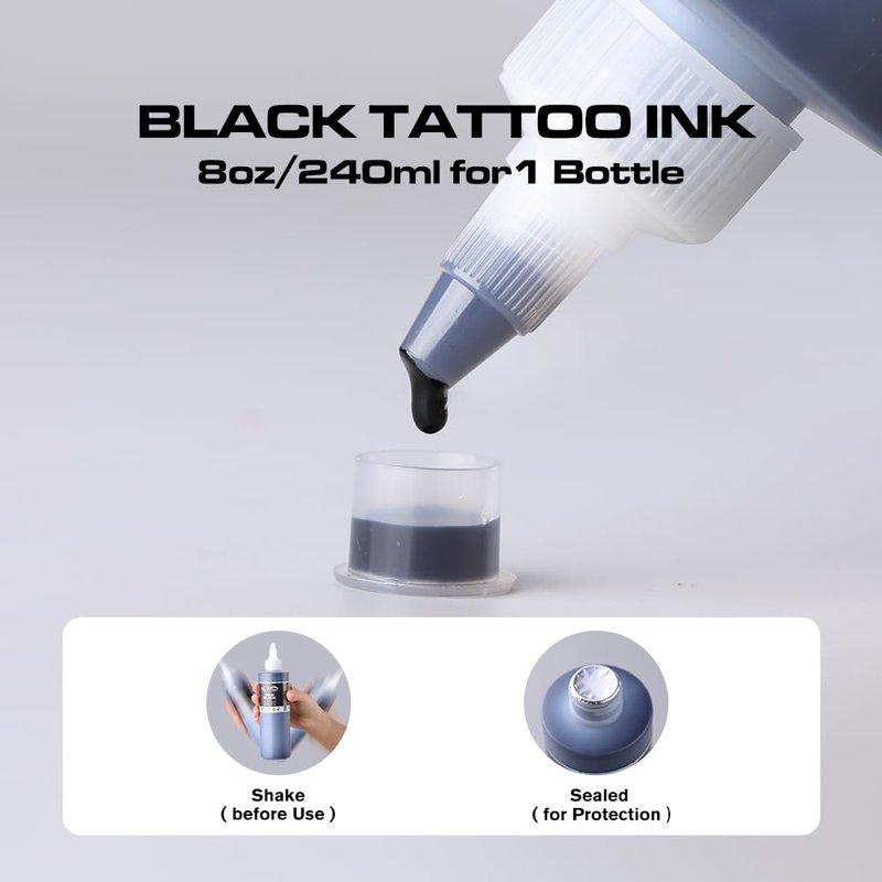 CNC 8oz Black Tattoo Ink Set 240ml True Black Vegan-Friendly Pigment Professional Tattoo Supplies for Lining, Shading, Blending Premium Skin-Safe Inks TI6003-240-001