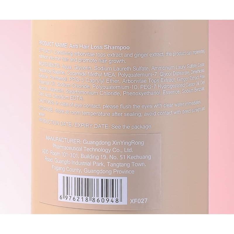 Introducing our Anti Hair Loss Shampoo, a powerful hair care solution designed to combat hair loss and promote healthy hair growth. Enriched with a potent blend of arborvitae tops extract and ginger extract, this nourishing formula replenishes essential nutrients, revitalizes the scalp, and stimulates hair follicles for stronger, fuller hair. Formulated with a carefully selected range of ingredients, including hydrating glycerin, cleansing sodium laureth sulfate, and conditioning panthenol, our shampoo provides a comprehensive approach to hair care. The arborvitae tops extract strengthens the hair roots, reducing breakage and promoting thicker strands, while the invigorating ginger extract stimulates blood circulation to awaken dormant follicles and encourage new hair growth. To use, simply wet your hair with warm water and apply an appropriate amount of shampoo. Massage the scalp gently for 3-5 minutes to generate a luxurious lather, allowing the powerful ingredients to penetrate deeply. Rinse thoroughly with clear water to reveal revitalized, nourished hair. Our Anti Hair Loss Shampoo also features the delightful scent of rose essential oil, creating a soothing and aromatic experience with every wash. The carefully curated combination of ingredients, including PEG-7 hydrogenated castor oil, further enhance the moisturizing and conditioning effects, leaving your hair soft, manageable, and beautifully fragrant. Trust our Anti Hair Loss Shampoo to provide the ultimate care for your hair, backed by a comprehensive blend of nourishing extracts and high-quality ingredients. Say goodbye to hair loss and hello to a confident, vibrant mane. Embrace the transformative power of our shampoo and experience the results for yourself.