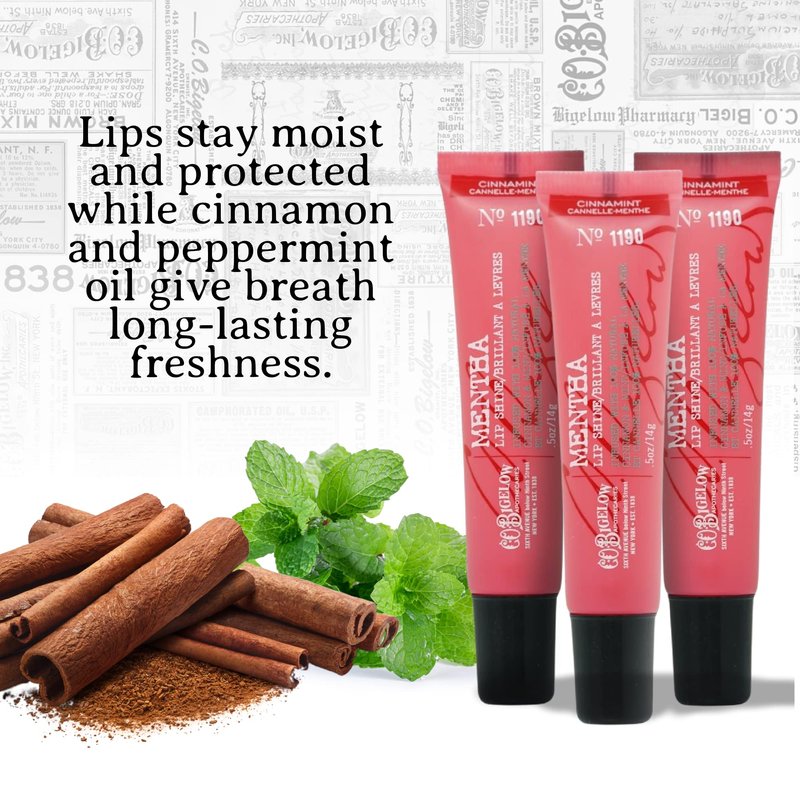 - SET INCLUDES (3) LIP BALMS No. 1190 Cinnamint Mentha Lip Shine. Formulated by Bigelow chemists. Cruelty free, never tested on animals. Made in the USA.