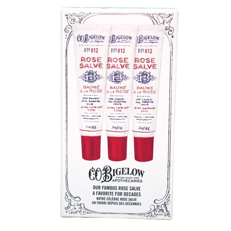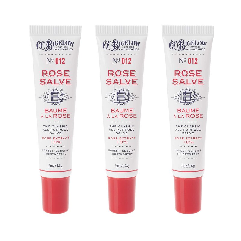 - SET INCLUDES (3) LIP BALMS No. 012 Rose Salve All-Purpose Salve 0.5 oz. Formulated by Bigelow chemists. Cruelty free, never tested on animals. Made in the USA.