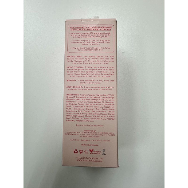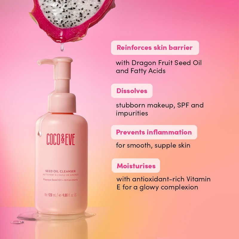 A daily oil based cleanser designed as the first step in your double cleansing routine Wash away the day, with ease Non-strippping: a gentle but hard working cleanser, the seed oils slough away impurities, makeup and stubborn SPF. Papaya seed oil, Dragonfruit & Banana: a fruity formula packed with Vitamin C, to promote a soft, radiant complexion. Coconut: our hero ingredient brings a calm, moisturising effect to the skin after every use