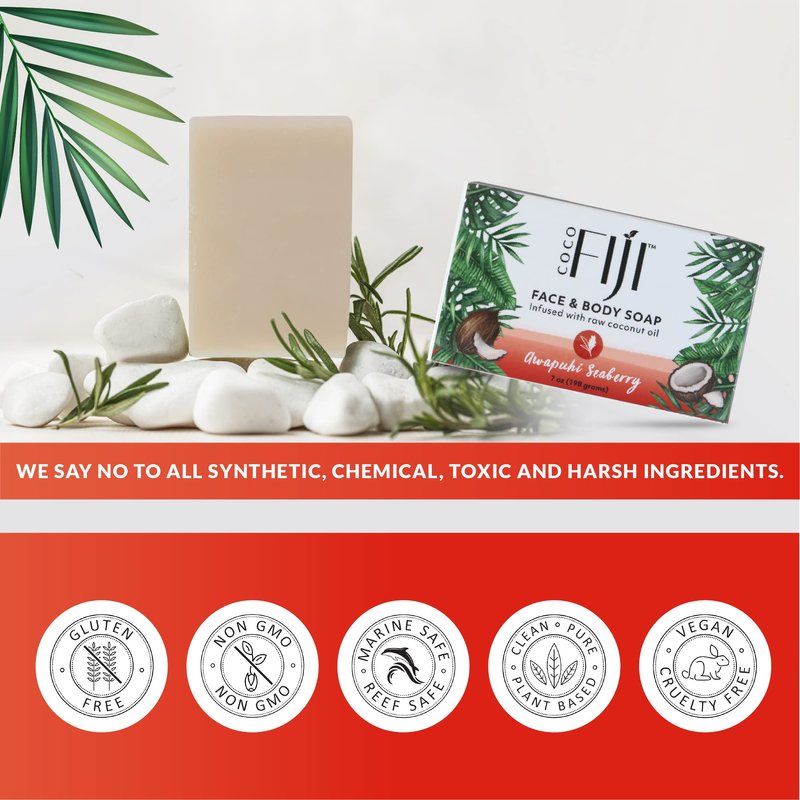 - Plant Based - Moisturizing Soap : Coco Fiji Soap Bar is infused with raw cold pressed organic coconut oil and Awapuhi Seaberry oils. This soap contains the goodness of raw cold pressed coconut organic coconut oil that gently cleanses leaviing your skin irresitibly smooth and soft as a baby's bottom. Our Coco Fiji Plant-Based Soap Bar is rich in lather and beautifully scented, leaving skin nourished and illuminated.
