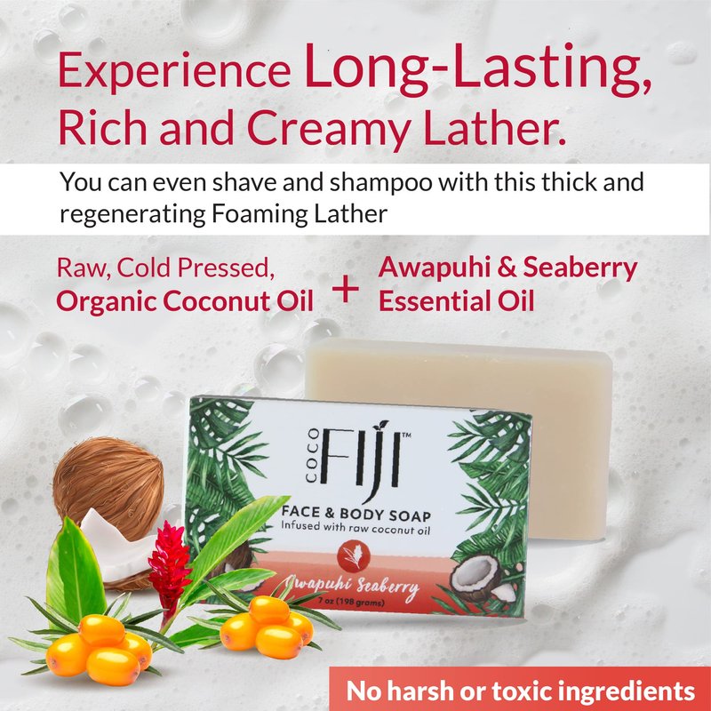 - Ultra Nourishing Recipe : Coco fiji soap for men and women is handcrafted and created using an ancient Fijian recipe. This process is a great way to make Vegan bar soap that is perfect for skin and environment with the ingredients from a sustainable source. Multi-functional this soap does it all, Cleanse, Shave, Shampoo! Our gentle soap pampers and moisturizes the skin with ultra rich-nourishing lather, rinsing off clean without residue and leaving only the fresh scent of Awapuhi Seaberry.