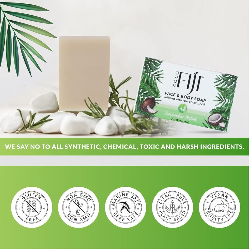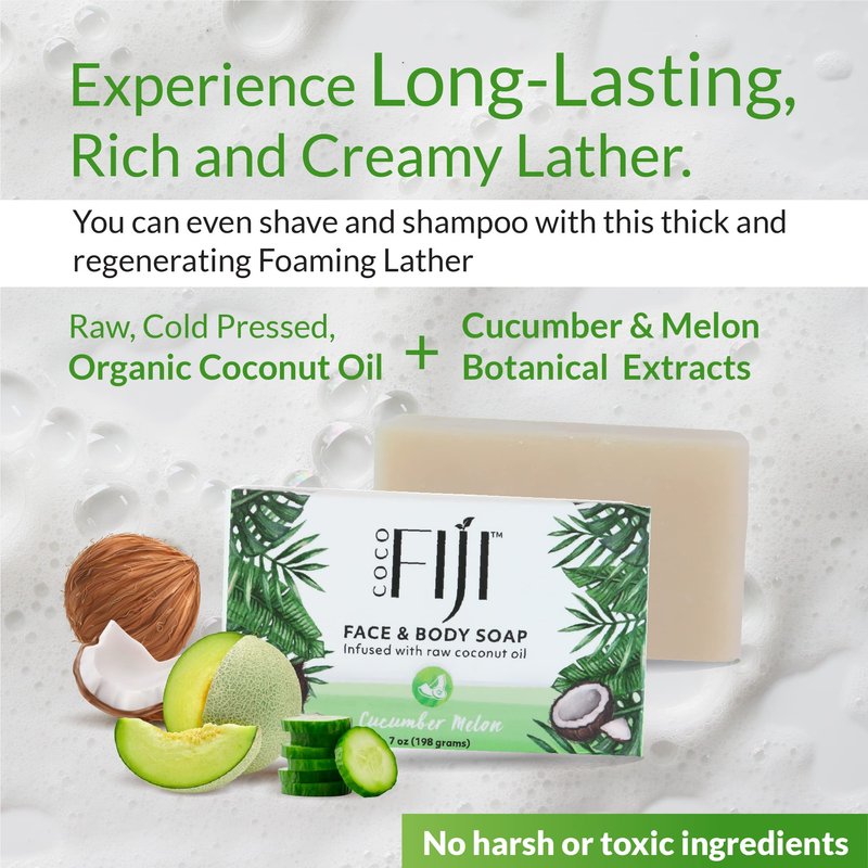 - Ultra Nourishing Recipe : Coco fiji soap for men and women is handcrafted and created using an ancient Fijian recipe. This process is a great way to make Vegan bar soap that is perfect for skin and environment with the ingredients from a sustainable source. Multi-functional this soap does it all, Cleanse, Shave, Shampoo! Our gentle soap pampers and moisturizes the skin with ultra rich-nourishing lather, rinsing off clean without residue and leaving only the fresh scent of Cucumber Melon.
