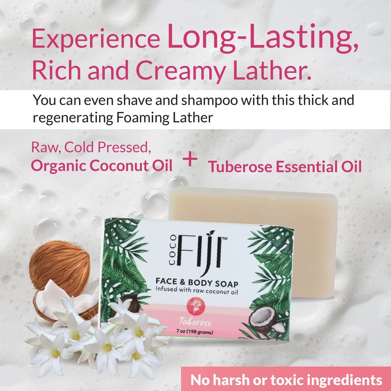 - Ultra Nourishing Recipe : Coco fiji soap for men and women is handcrafted and created using an ancient Fijian recipe. This process is a great way to make Vegan bar soap that is perfect for skin and environment with the ingredients from a sustainable source. Multi-functional this soap does it all, Cleanse, Shave, Shampoo! Our gentle soap pampers and moisturizes the skin with ultra rich-nourishing lather, rinsing off clean without residue and leaving only the fresh scent of Tuberose.