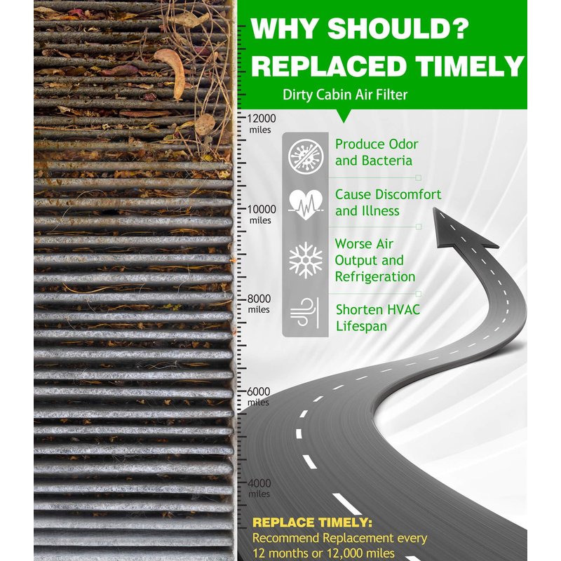 - [EASY TO INSTALL]Recommended replacement every 12 months or 12,000 miles.Note: Please check the Cabin Air Filter’s size to make sure if it fit your car.