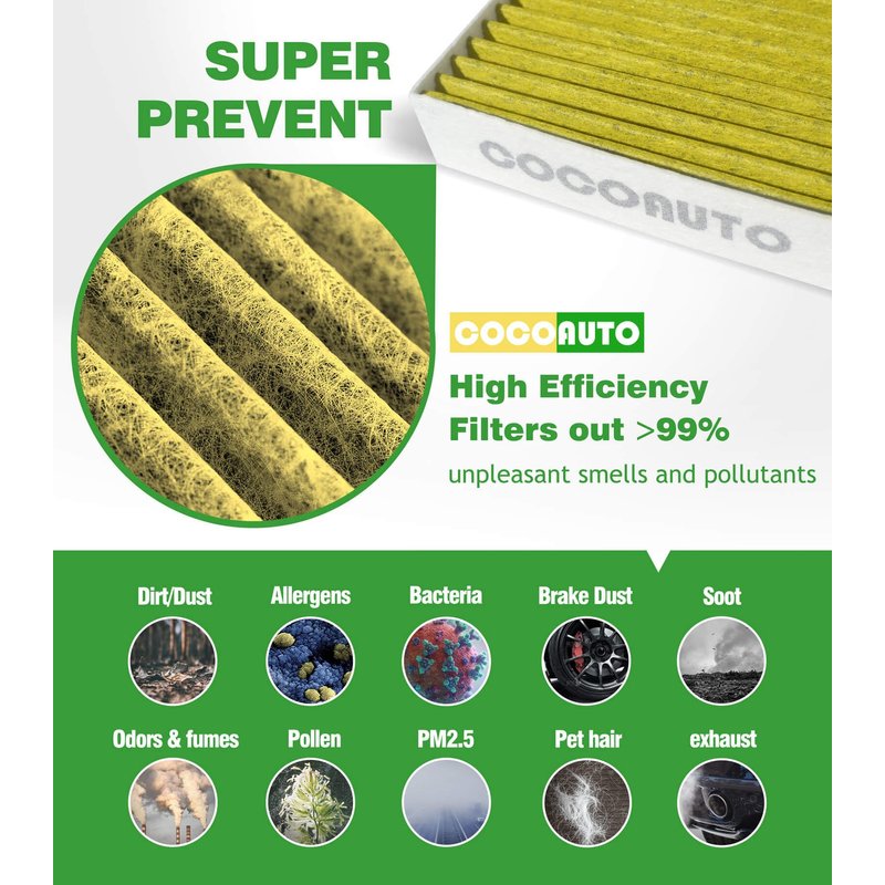 - [OEM QUALITY] COCOAUTO cabin air filter uses 4 layer Filtration Technology,enriched with coconut shell activated carbon,effectively filters 99% of dust, pollen, peculiar odors, and other airborne particles.