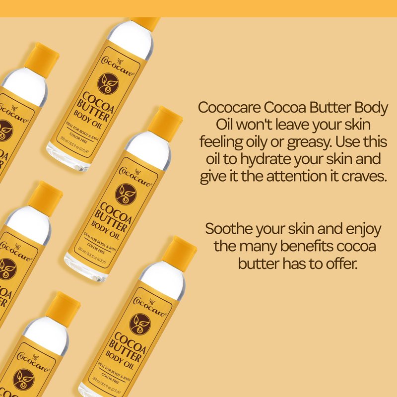 - LONG LASTING - Cococare Cocoa Butter Body Oil won't leave your skin feeling oily or greasy but will maintain moisturized skin all day. Use this oil to hydrate your skin and give it the attention it craves.