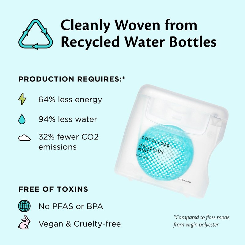 - PLANET-FRIENDLY, CLEAN, AND CRUELTY-FREE: Cleanly spun from ~85% recycled water bottles; refillable dispenser; less waste than plastic picks and flossers; free of parabens, sulfates, and PFAS; no irritating flavors; Leaping Bunny–certified cruelty-free.