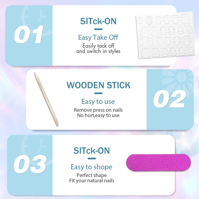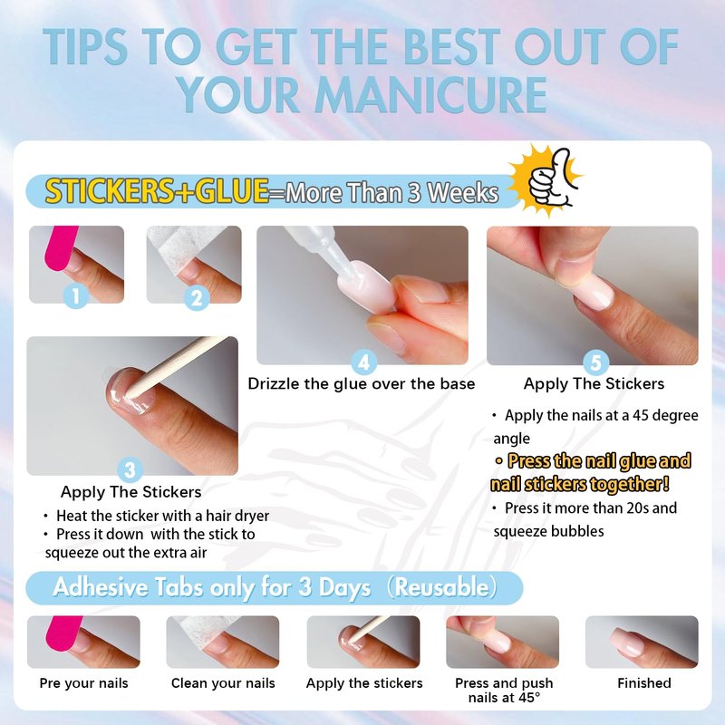 2.Please note that the nail glue is not included.If you want it last for a longer time,please use nail glue instead of the nail stickers.