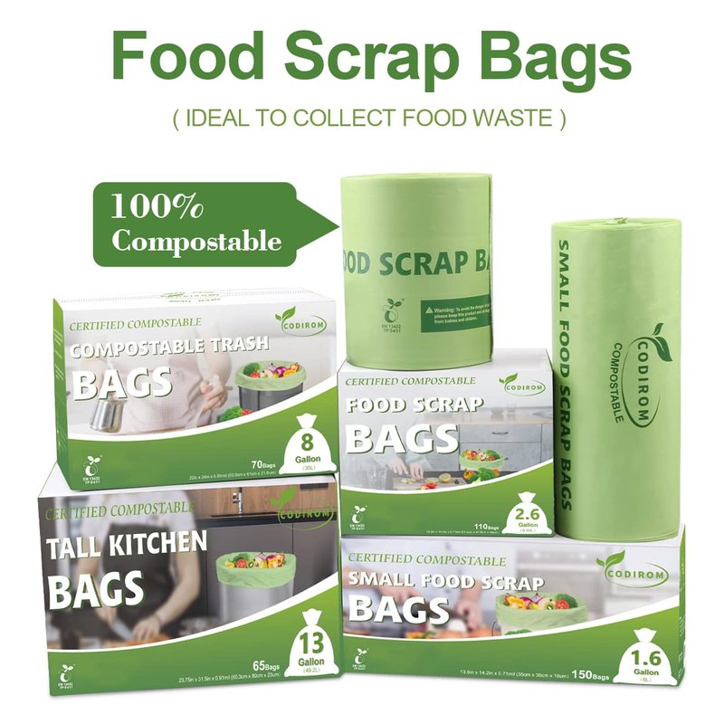 - ♻ Compost Certified: Codirom compost bags are certified by the Products Institute and comply with U.S. standards ASTM D6400, NF T51-800:2015, and EN13432. These certifications ensure that our bags are completely compostable and will break down naturally in landfills over 90-180 days, leaving behind only H2O, CO2, and rich humus. The degradation process can even be accelerated in composting facilities.
