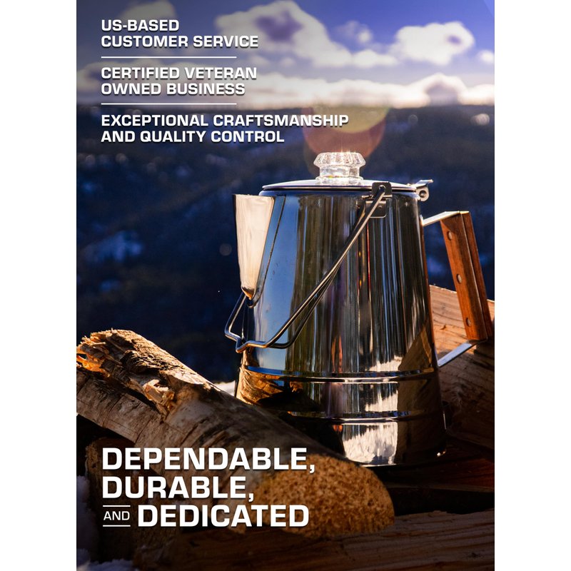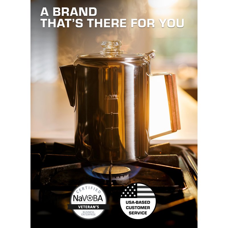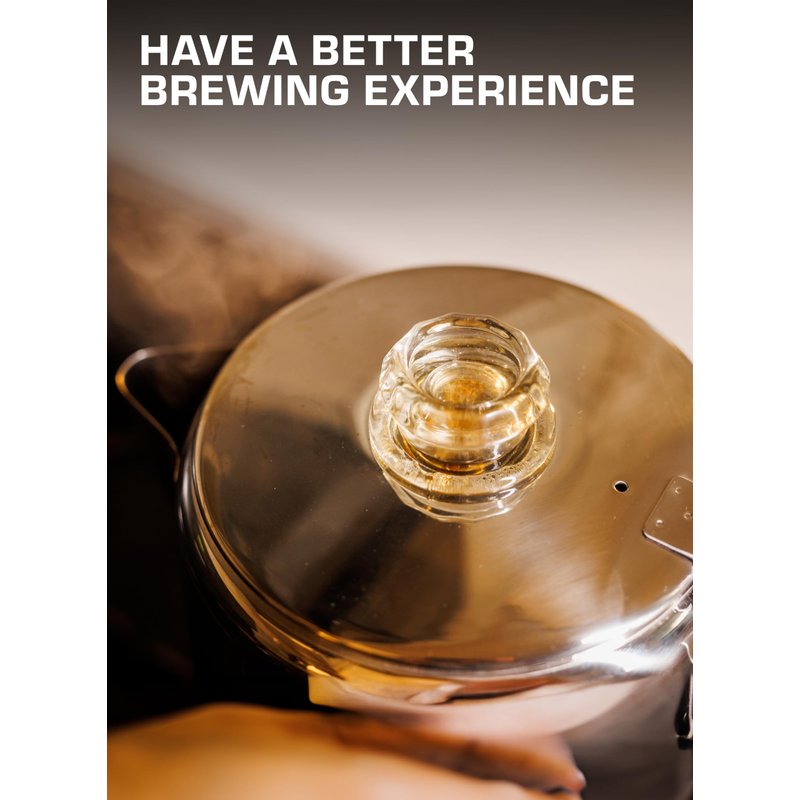 - DURABLE GLASS PERCOLATOR TOP: Kiln baked & tempered coffee percolator glass. Reinforced to take the heat and hold true during the brewing process. Make no compromises for your morning cup o’ joe