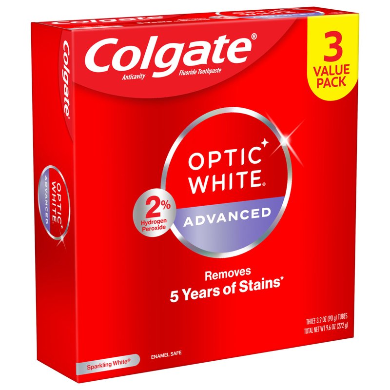 - Includes three (3) 3.2 oz tubes of Colgate Optic White Advanced Sparkling White Hydrogen Peroxide Toothpaste, Teeth Whitening Toothpaste