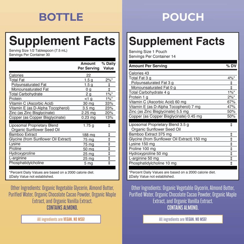 - Collagen Booster Liposomal: A delicious liposomal to support your body’s ability to make collagen! Our Vegan Collagen Booster Liposomal contains 5 amino acids as well as nutrients such as vitamins C & E | zinc | copper | and silica! Support your skin and joint health with this delicious Maple Hot Cocoa liposomal.
