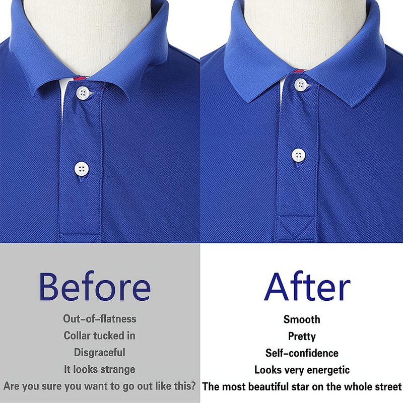 - It is suitable for all kinds of collar angle switches. It fits well and is not exposed. It is beautiful and natural. Great for any shirt with a collar This product has strong stickiness, lasting adhesion, no glue left after tearing, and can perfectly support the collars of shirts, polo shirts, denim shirt, etc.