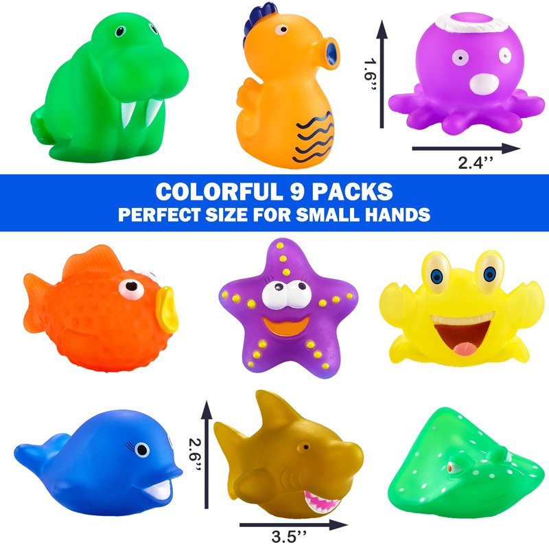 - 【9 PACKS SEA CREATURES BATH TOYS FOR KIDS】: We provide 9 packs of sea animal toys with a mesh bag for kids. There are 9 unique designs including seahorse, crab, octopus and so on. Perfect as water toys, bath toys, bathtub toys, squeeze toys, bathroom toys, animal toys, party favors, stocking stuffers, Goody Bag Fillers, Classroom Prizes and Pinata Fillers.