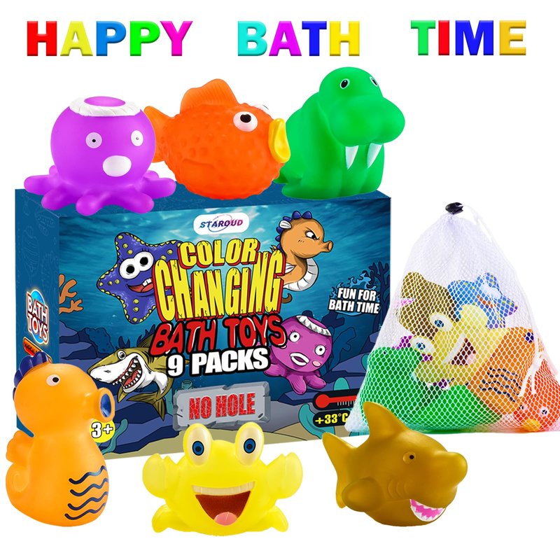 - 【COLOR CHANGING TOYS】: 9 packs of sea creatures toys magically change colors in warm water above 33℃ for few seconds. Vivid designs and magical skills will be a big surprise for kids.