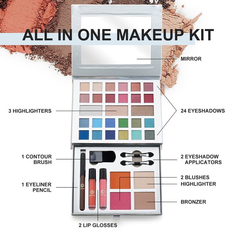 - [All in One Makeup Kit] This compact makeup kit includes 24 matte and shimmer eyeshadows, 4 highlighters, 2 blushes, 1 bronzer, 2 lip glosses, a brown eyeliner pencil, a contouring brush, 2 dual-sided applicators and a mirror, which covers full face makeup.