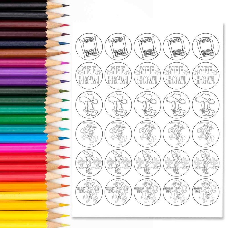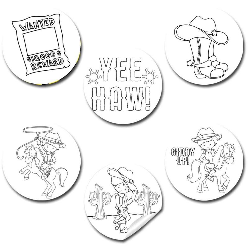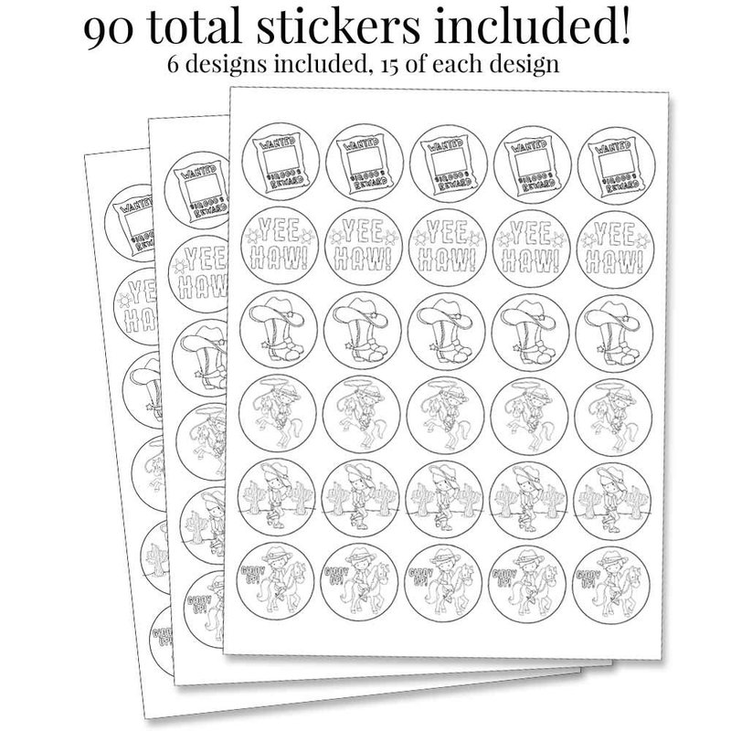 Color Your Own Wild West Cowboy Themed Birthday Party Favor Sticker Labels for Kids, 90 1.5" Party Circle Stickers by AmandaCreation, Great for Arts & Crafts, Envelope Seals, Goodie Bags & Treats