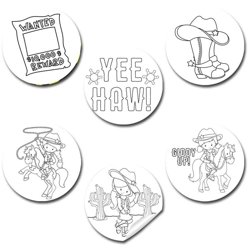 Color Your Own Wild West Cowgirl Themed Birthday Party Favor Sticker Labels for Kids, 90 1.5" Party Circle Stickers by AmandaCreation, Great for Arts & Crafts, Envelope Seals, Goodie Bags & Treats