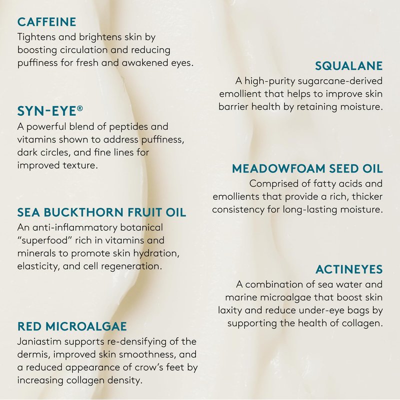 - Carefully-selected specialty ingredients address and visibly improve key eye concerns: depuffing, hydrating, dark circles, fine lines and wrinkles, crow's feet.