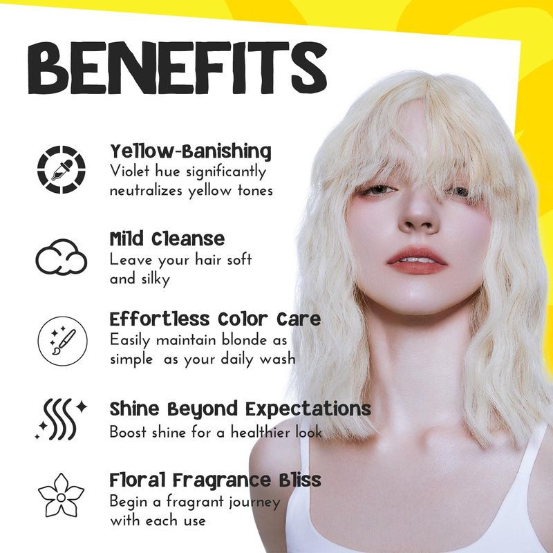 COLORLOMO Bye Bye Yellow Purple Shampoo is your go-to solution to help maintain blonde hair color. This 100% sulfate-free shampoo neutralizes unwanted yellow and brassy undertones. Formulated for colored hair, blonde hair, bleached hair, highlighted brown hair, and silver hair.HueSync Tech features a precisely formulated purple pigment that effectively neutralizes the unwanted yellow tones, making it easy to achieve salon-quality results at home.Unlock the full potential of vibrant, long-lasting color by exploring our recommended products below:Color Maintenance Shampoo——Preserve your brilliance between color sessionsApplication Kit——Elevate your dyeing experience with our pro toolsColor Drops——Customize and intensify your hue for a personalized touchColor Depositing Conditioner——Intensify your color and infuse vibrancy with our specialized conditioner
