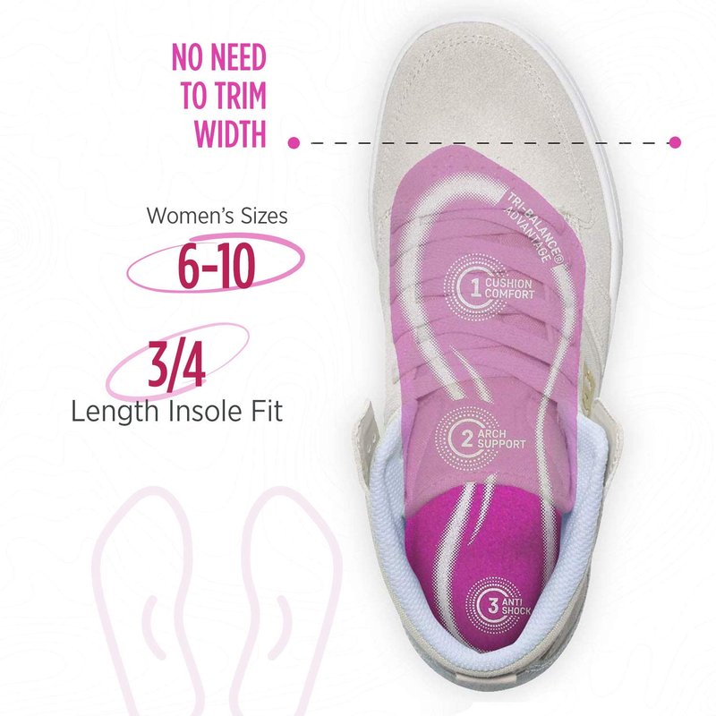 - Step with Confidence - Insoles are 3/4 length, allowing your toes to move freely within your shoe; Non-slip design prevents insole from sliding; One-size insole fits most women's shoe sizes 6-10