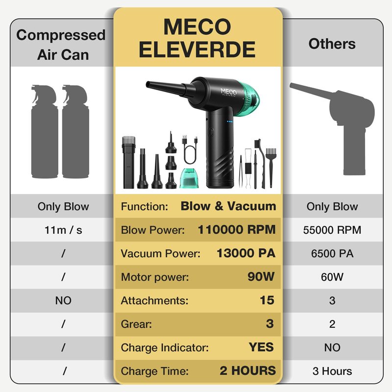 - [Superior Cleaning & Dust Removal Function]: MECO-CR1 Compressed air duster & Vacuum offer a superior cleaning and dust removal experience. They feature 90W robust motors with speeds of up to 110,000 RPM and provide impressive suction of 13,000PA, ensuring efficient dust removal. These devices boast a dual-function design, allowing them to both blow away and vacuum dust, effectively eliminating accumulated particles.