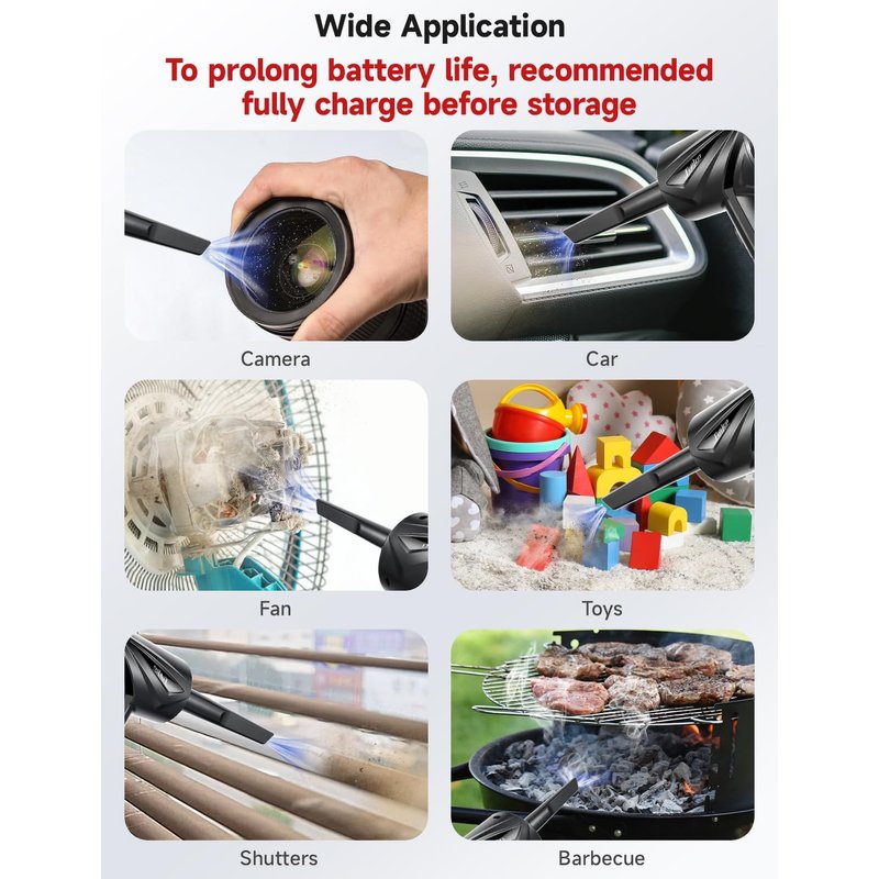 - [Environmental Protection and Energy Saving]: Compared with compressed air can, our cordless air duster do not produce chemicals, liquids or ice during the cleaning process. It protects your electronics from liquids. The air blower be used multiple times, it saves you money and protects the environment.