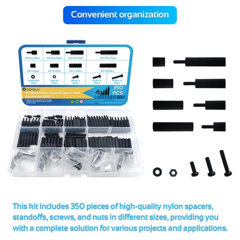 - 👍Comprehensive Set: This kit includes a total of 350 pieces of M2 black male-female nylon hex spacers, standoffs, screws, and nuts in different sizes, making it a complete solution for various projects and applications. This wide range of sizes provides versatility and convenience, allowing you to choose the right size for your project.