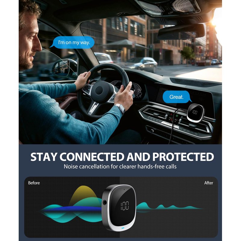 - 【CLEARER HANDS-FREE CALLS】Our Bluetooth aux adapter gives you a realistic and clear call sound. It has a built-in microphone for good sound pickup, and CVC8.0 noise reduction technology to filter out echoes and background noise. You can answer/redial/hang up/reject calls with the multi-function button, freeing up your hands. Broadcasting from navigation Apps, the Bluetooth stereo receiver also ensures safe driving!
