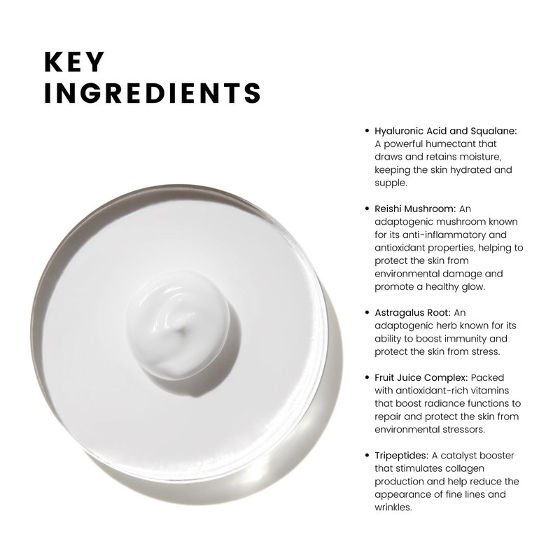 - Nourishing and Revitalizing: A blend of adaptogenic mushrooms and fruit juice complex, provides the skin with essential nutrients to nourish, revitalize, and protect against environmental damage.
