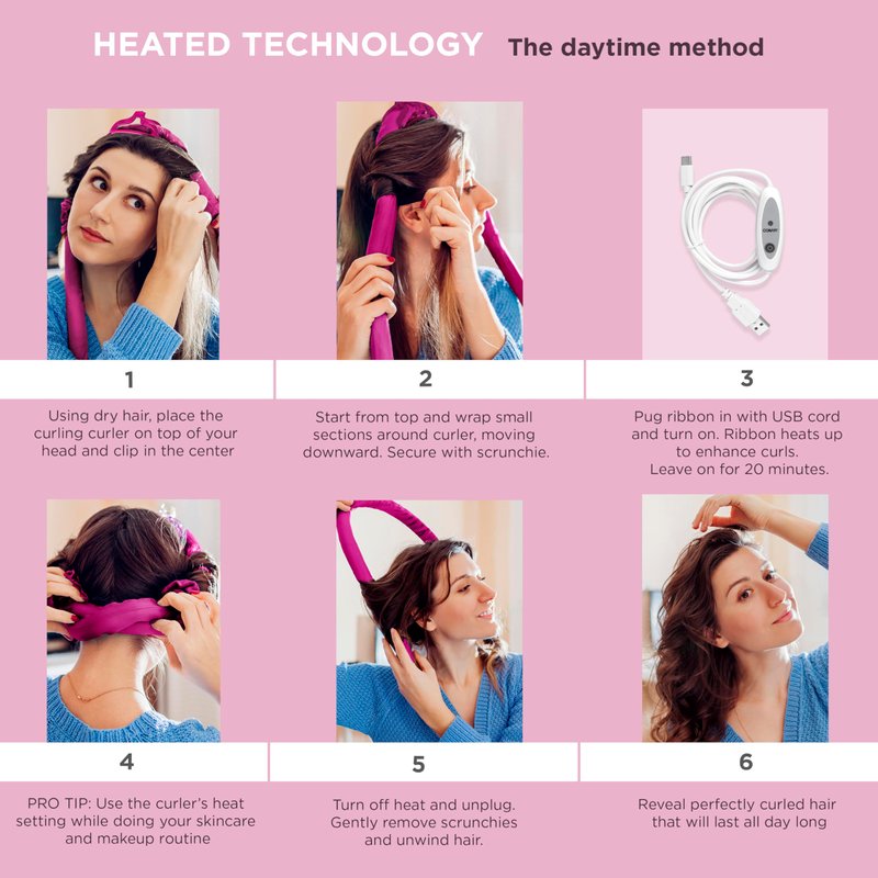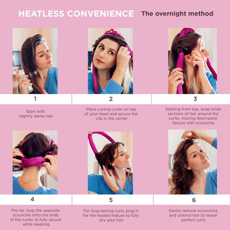 - Heat / Heatless Smooth Satin Hair Curler: The smooth satin material creates shiny curls without heat damage. Use the gentle heat setting for curls that will last all day. It heats up quickly for use on dry hair or use the heatless method on damp hair.
