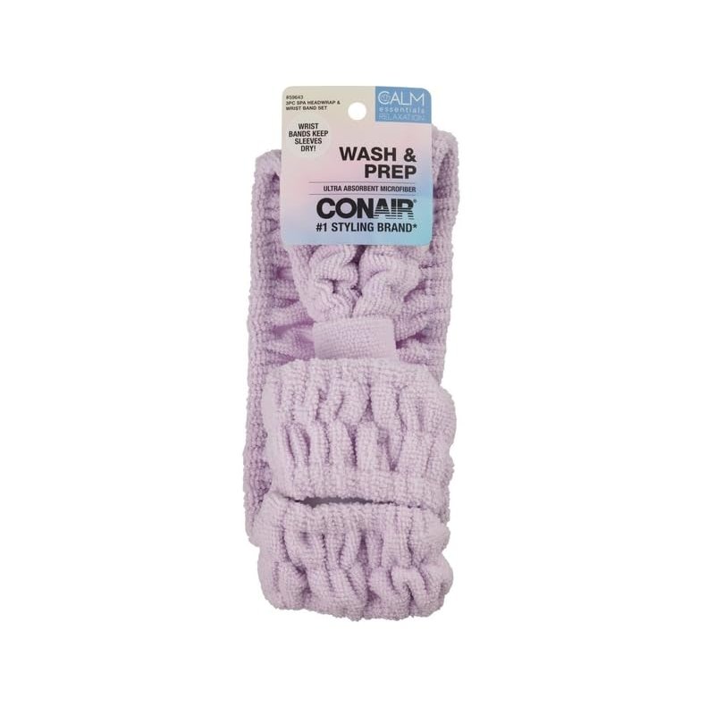 3pc Spa Headwrap & Wrist Band Set. Conair has everything you need for beautiful hair. Hold back your hair with this cozy spa headwrap. The wide purple fleece band protects hair from tangles and frizz. Wear it around the hairline and keep hair away from the face so you can wash or apply makeup with ease. The matching wrist bands help keep your sleeves dry! About Conair Styling and Grooming: Its all here-an array of grooming essentials from the #1 Styling Brand,* the name you can trust to always help you look and feel your best. The Conair lineup of top-quality mirrors, combs, shears, hair towels, and rollers ensures you have the tools you and your family need to stay perfectly primped. Make your beauty regimen easier. Count on Conair to provide products of the highest quality and value for all your grooming and styling needs.