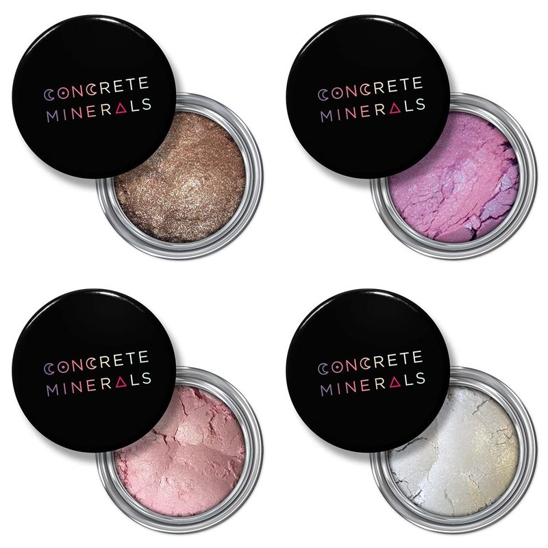 Concrete Minerals started over 10 years ago in Riverside, CA. We were dreaming of a line of mineral cosmetics that wasn't so completely and utterly boring. All the sass of your favorite cosmetics brands, with none of the trash ingredients. We're passionate about creating high-end vegan, cruelty-free products with a unique twist! All of our products always exclude scary preservatives like parabens and talc and bismuth oxychloride! The planets have aligned. Now this sparkly collection can be all yours! Includes 4 super pigmented mineral eye shadows: Party Monster (Glittery golden-honey), Angel Dust (Pink-lavender w/ bright aquamarine shift), Prude (Pale shimmery pink) and Frost (Sparkling white).