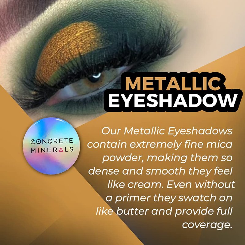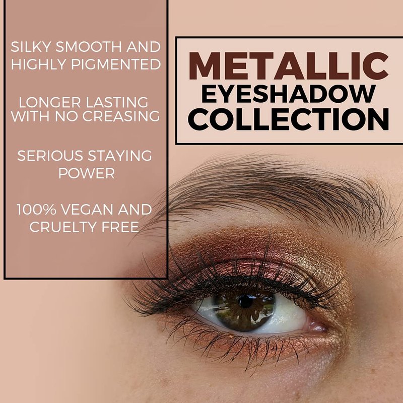 - Metallic — our metallic eyeshadows contain extremely fine mica powder, making them so dense and smooth they feel like cream. Even without a primer they swatch on like butter and provide full coverage. Enjoy our longer-lasting formula with NO creasing. Fade-proof and smudge-proof, no more worrying about fallout ruining your look