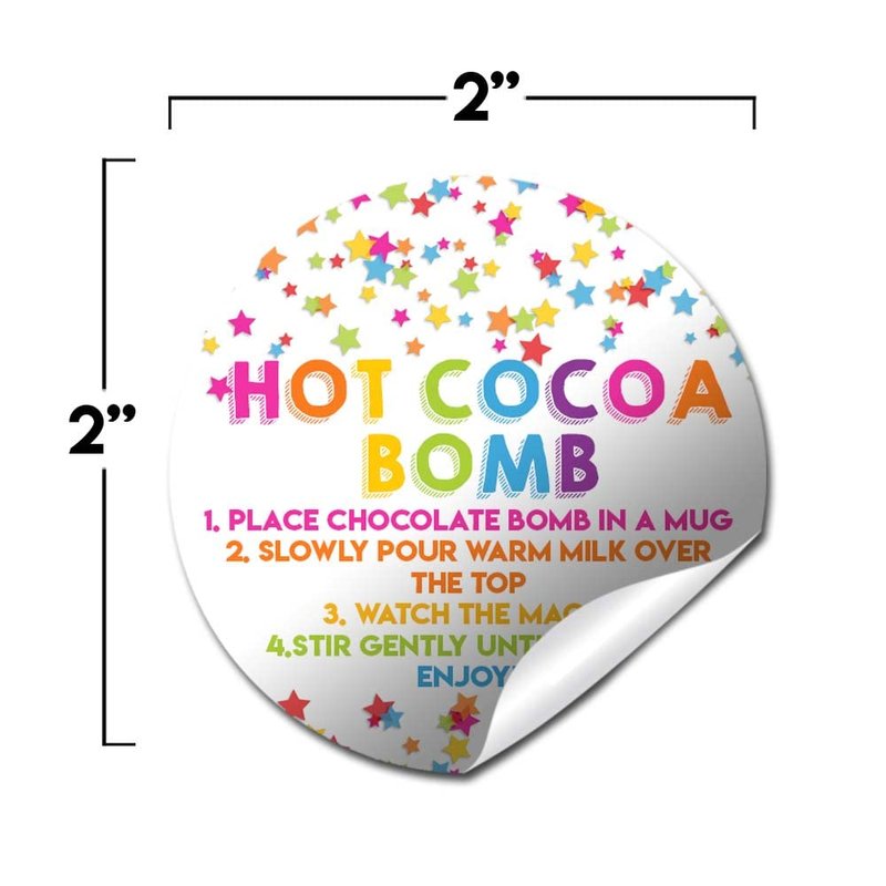 - Cocoa Bomb Overload: Hot cocoa bombs are all the rage this year! Giving some out as gifts and want your packaging to stand out? Designed by a talented mom, these fun stickers feature a cute confetti rainbow stars design, plus all the detailed cocoa bomb instructions to fit perfectly on a package. These are great for making your hot chocolate bomb gift packs extra special for your friends & loved ones! Amanda Creation. Original design by Amanda Creation.
