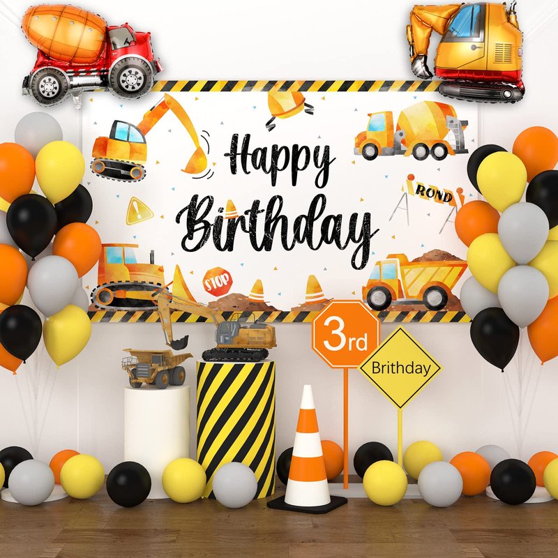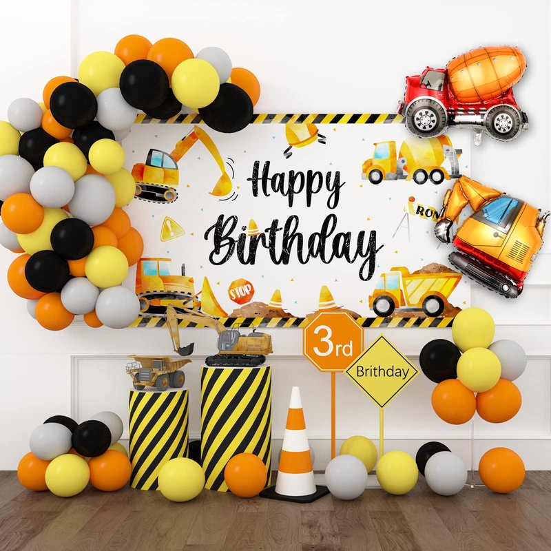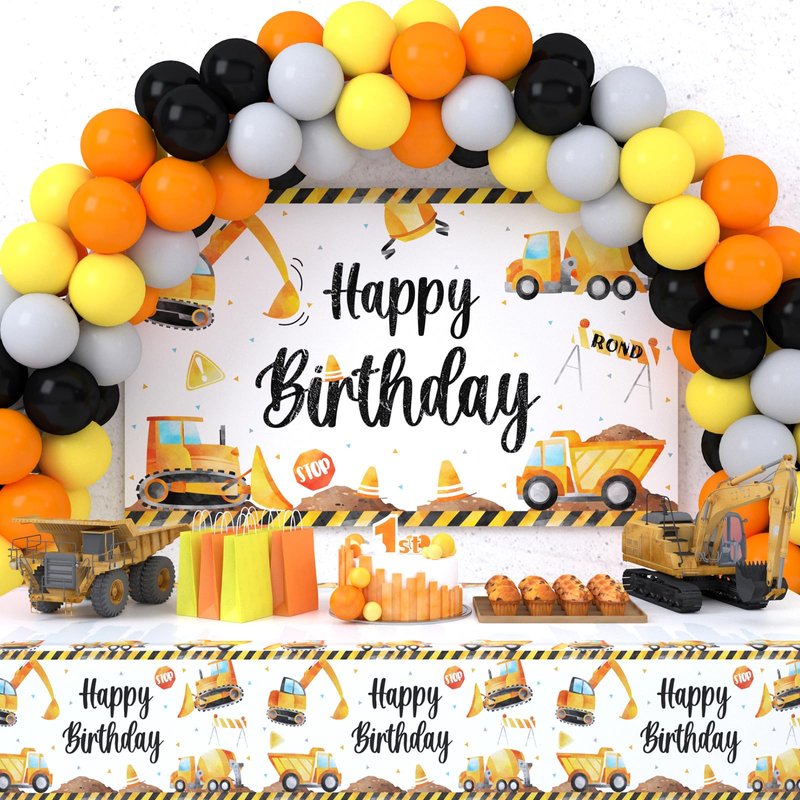 - 【Package Includes】1 backdrop (size:70.8x43.3 in), 1 tablecloth (size:108x54 in), 1 excavator foil balloon (size:22x19 in), 1 cement truck foil balloon (size:26x19 in), 20 pcs 10 inch orange balloons, 20 pcs 10 inch yellow balloons, 20 pcs 10 inch black balloons, 20 pcs 10 inch gray balloons, 4 pcs accessories.